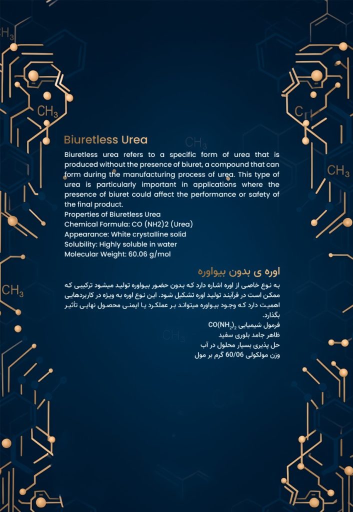 Biuretsiz üre, üretim süreci sırasında oluşabilen biuret bileşiğini içermeyen özel bir üre türüdür. Biuretin varlığı, bazı uygulamalarda ürünün performansını veya güvenliğini olumsuz etkileyebileceğinden, bu tür üre özellikle hassas endüstriyel kullanımlar için önemlidir. Biuretsiz Ürenin Özellikleri: • Kimyasal Formül: CO(NH₂)₂ (Üre) • Görünüm: Beyaz kristal katı • Çözünürlük: Suda yüksek oranda çözünür • Molekül Ağırlığı: 60.06 g/mol