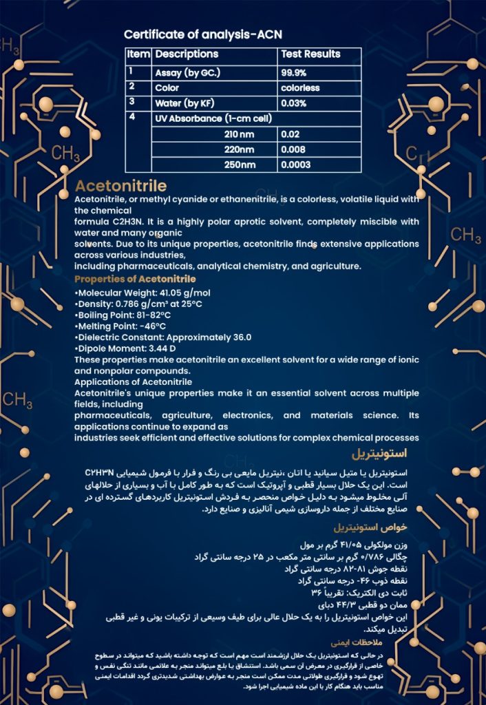 Acetonitrile, metil siyanür veya etan nitril olarak da bilinen, kimyasal formülü C₂H₃N olan renksiz ve uçucu bir sıvıdır. Yüksek derecede polar ve aprotik bir çözücü olup, su ve birçok organik çözücü ile tamamen karışabilir. Benzersiz özellikleri sayesinde asetonitril; ilaç, analitik kimya ve çeşitli endüstriyel sektörlerde geniş bir kullanım alanına sahiptir.⸻ Acetonitrile Özellikleri Moleküler Ağırlık: 41,05 g/mol Yoğunluk: 0,786 g/cm³ (25°C’de) Kaynama Noktası: 81–82°C Donma Noktası: –46°C Dielektrik Sabiti: Yaklaşık 36 Dipol Moment: 3,44 Debye Bu özellikler, asetonitrili iyonik ve apolar bileşiklerin geniş bir yelpazesi için mükemmel bir çözücü haline getirir.⸻ Güvenlik Önlemleri Acetonitrile değerli bir çözücü olmasına rağmen, belirli maruziyet seviyelerinde toksik olabileceğini unutmamak önemlidir. Soluma veya yutma, nefes darlığı ve bulantı gibi belirtilere yol açabilir. Uzun süreli maruziyet, daha ciddi sağlık sorunlarına neden olabilir. Bu kimyasal ile çalışırken uygun güvenlik önlemleri alınmalıdır.