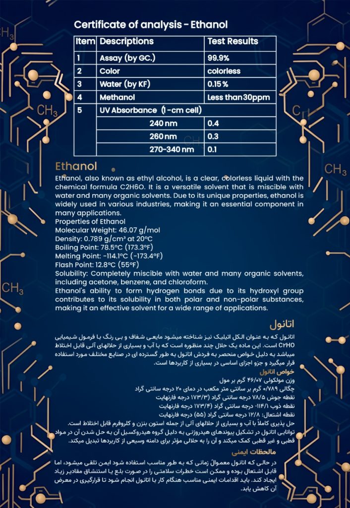 Ethanol, also known as ethyl alcohol, is a colorless, transparent liquid with the chemical formula C₂H₅OH. It is a multi-purpose solvent that is miscible with water and many organic solvents. Thanks to its unique properties, ethanol is widely used in a variety of industries and is a key ingredient in many applications.⸻ Ethanol Properties • Molecular Weight: 46.07 g/mol • Density: 0.789 g/cm³ (at 20°C) • Boiling Point: 78.5°C • Freezing Point: –114.1°C • Flash Point: 12.8°C • Solubility: Completely miscible with water and many organic solvents (acetyl benzene, chloroform, etc.). Ethanol's ability to form hydrogen bonds, thanks to its hydroxyl group, facilitates its dissolution in polar and nonpolar substances, making it an effective solvent for a wide range of applications . ⸻ Safety Precautions : While ethanol is generally considered safe when used appropriately, it is flammable and can pose health risks if inhaled or ingested in large quantities. Appropriate safety precautions should be taken when handling ethanol, and exposure should be minimized .