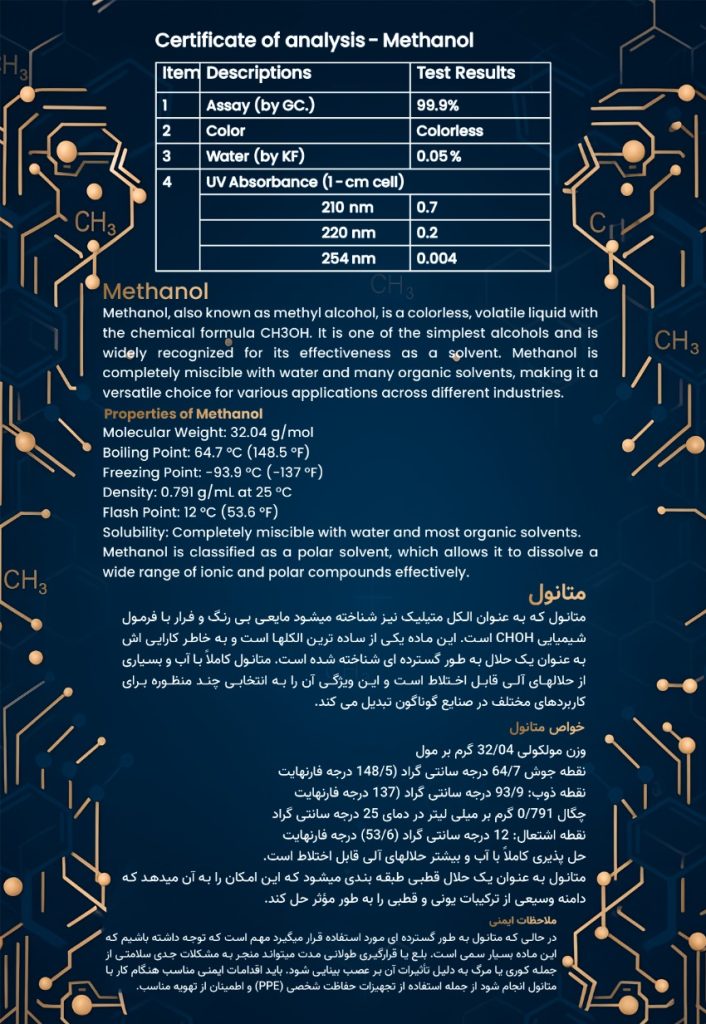 Metanol, metil alkol olarak da bilinen, kimyasal formülü CH₃OH olan renksiz ve uçucu bir sıvıdır. En basit alkollerden biridir ve çözücü olarak yüksek verimliliği sayesinde yaygın olarak kullanılmaktadır. Metanol, su ve birçok organik çözücü ile tamamen karışabilir; bu özelliği, onu farklı endüstrilerde çok amaçlı bir tercih haline getirir. ⸻ Metanolün Özellikleri • Molekül Ağırlığı: 32.04 g/mol • Kaynama Noktası: 64.7 °C (148.5 °F) • Erime Noktası: −93.9 °C (−137 °F) • Yoğunluk: 0.791 g/cm³ (25 °C’de) • Alevlenme Noktası: 12 °C (53.6 °F) • Çözünürlük: Su ve çoğu organik çözücü ile tamamen karışabilir. Metanol, polar bir çözücü olarak sınıflandırılır; bu da iyonik ve polar bileşikleri etkili bir şekilde çözmesine olanak tanır. ⸻ Güvenlik Önlemleri Metanol yaygın olarak kullanılmasına rağmen, yüksek derecede toksik bir maddedir. Yutulması veya uzun süre maruz kalınması ciddi sağlık sorunlarına — örneğin görme kaybı veya sinir sistemi hasarı — neden olabilir. Bu nedenle metanol ile çalışırken uygun kişisel koruyucu ekipman (KKE) kullanılmalı ve yeterli havalandırma sağlanmalıdır.
