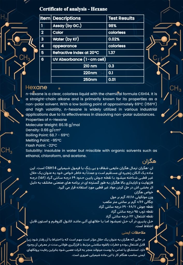 n-Heksan (normal heksan) , kimyasal formülü C₆H₁₄ olan renksiz ve şeffaf bir sıvıdır. Düz zincirli bir alkan olup, genellikle non-polar bir çözücü olarak özellikleriyle bilinir. Yaklaşık 69 °C (156 °F) kaynama noktasına ve yüksek uçuculuğa sahip olan heksan, polar olmayan maddeleri çözme konusundaki etkinliği sayesinde çok sayıda endüstriyel uygulamada yaygın olarak kullanılır. ⸻ Heksanın Özellikleri • Molekül Ağırlığı: 86.18 g/mol • Yoğunluk: 0.66 g/cm³ • Kaynama Noktası: 68.7 – 69 °C • Erime Noktası: −95 °C • Alevlenme Noktası: 22 °C • Çözünürlük: Suda çözünmez, ancak etanol, kloroform ve aseton gibi organik çözücülerle karışabilir. ⸻ Güvenlik Önlemleri Heksan etkili bir çözücü olmasına rağmen, yanıcı bir madde olup dikkatli kullanılmalıdır. Uzun süreli maruz kalma, sinir sistemi üzerinde olumsuz etkiler oluşturabilir. Solunması veya ciltle teması durumunda sağlık riski yaratabileceğinden, heksanla çalışırken uygun güvenlik protokollerine uyulmalı ve koruyucu ekipman kullanılmalıdır.